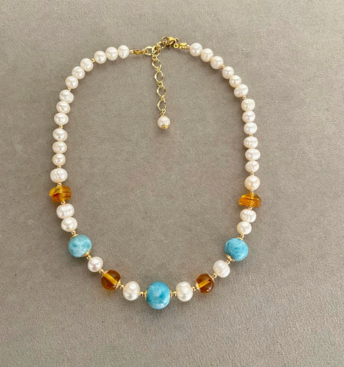Choker clásico Larimar, Ámbar y Perlas.